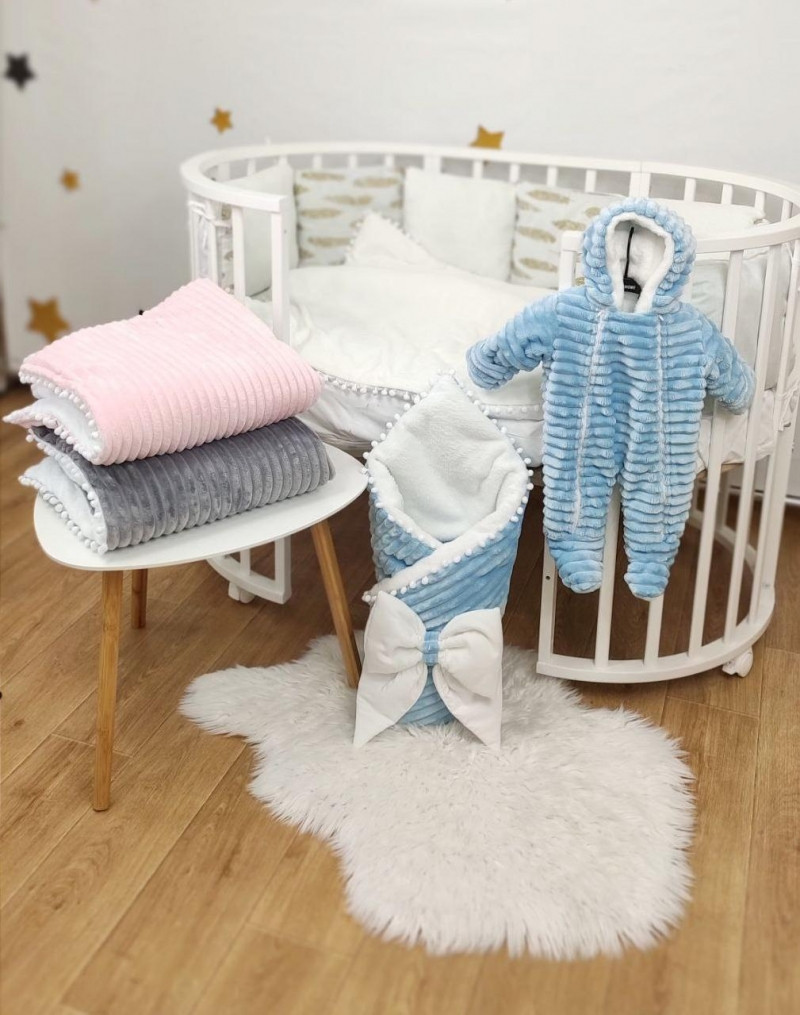 Конверт-плед підійде як для урочистої виписки з пологового будинку, так і для прогулянок в холодну пору року. Конверт трансформується в плед. На куточку конверта є красиві китиці. В комплекті є бант.