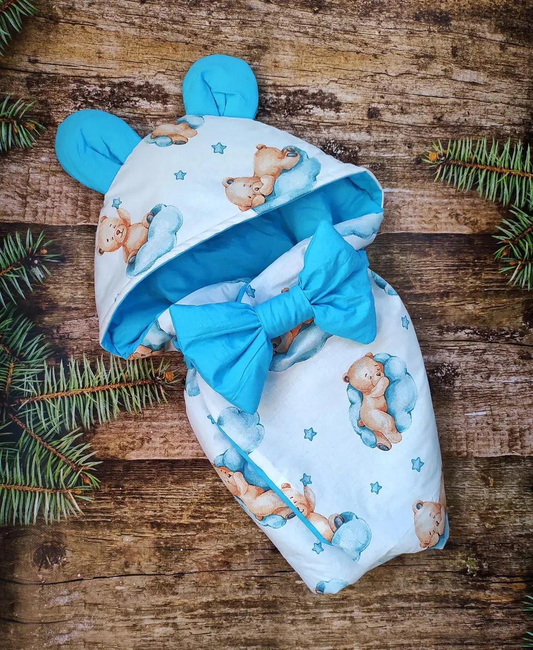Конверт для новонароджених на виписку з пологового з вушками весна/літо бавовна 100% Ведмежатко ШкодаМода Блакитний