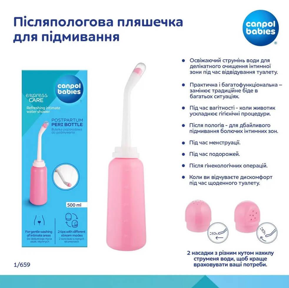 Післяпологова пляшечка Canpol babies допомагає легко та гігієнічно доглядати за інтимними ділянками під час користування туалетом. Вона є незамінним аксесуаром під час вагітності, після пологів, менструації чи подорожей, знижуючи ризик подразнень та інфекцій.